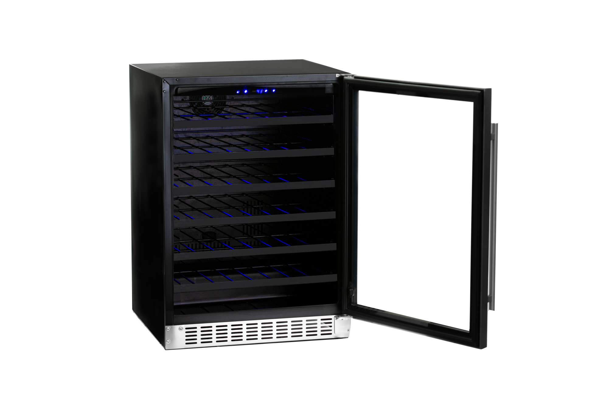 Inside, six full-extension wine racks glide smoothly and showcase bottles against soft blue LED lighting. Digital temperature controls and dual-sensor technology help maintain stable cooling performance, and the bottom-venting design allows for seamless built-in installation.